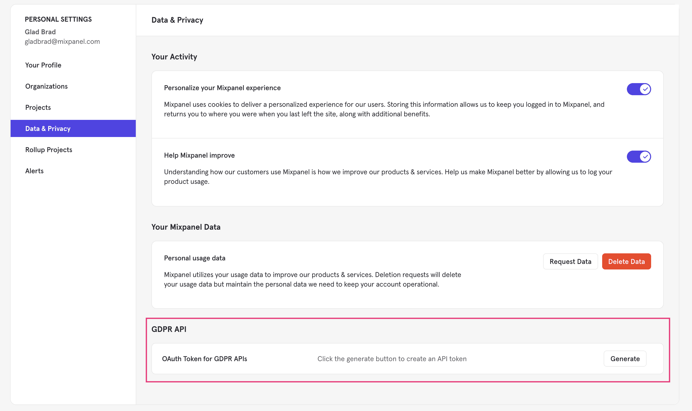 In order to submit a request, you must first generate a GDPR OAuth token from your Personal Settings. This token is required for requests submitted both through the Mixpanel interface and through Mixpanel’s APIs. Users can retrieve this token from their Account Settings by selecting their initials in the top right of Mixpanel and selecting Profile & Preferences, and then the Data & Privacy tab. The OAuth token has a one year expiry. For requests submitted via API, the token should be passed in the Authentication header. Users are eligible to generate an OAuth token if they are the Project Owner, or if they are a Project Owner or Admin of a project that supports team member roles.
